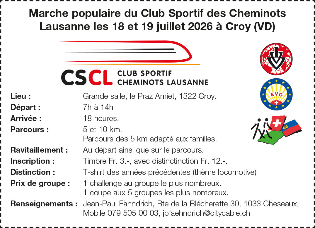 Marche Marche populaire Fähndrich Jean-Paul Responsable Section Marche Tél : +41 79 505 00 03 Mail : jpfaehndrich@citycable.ch Marche des cheminots des 19 et 20 juillet 2025 à Croy Le CSCL est membre du Journal des Marches Populaires Romandes